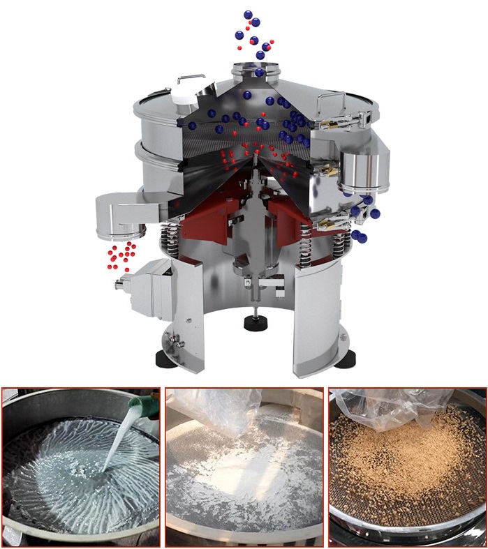 氣旋篩使用一組槳葉將產品推出篩網圓柱體,高速旋轉它們并對產品施加離心力,圓柱體水平安裝,因此對槳葉施加輕微的扭轉以將產品沿著圓柱體的長度向下移動,并且使用螺旋鉆以穩定的速度喂入槳葉。與振動篩相比,這些槳葉迫使產品通過篩網,從而使它們具有更高的吞吐量,旋轉螺旋鉆和槳葉組件的運動具有分解塊或分離壓實產品的額外好處。