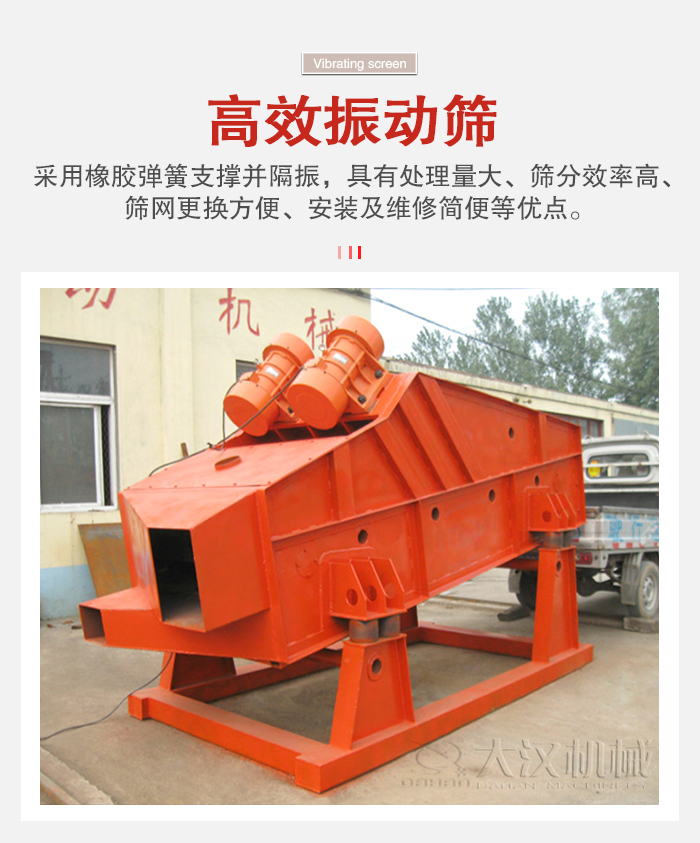 高效振動篩是利用振動電機或普通電機激振器做為振動源,使篩體沿激振力方向作周期性往復振動,物料在篩面上沿直線方向作拋物線運動,從而達到篩分目的。