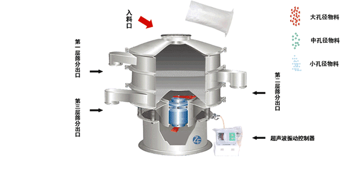 超聲波振蕩篩在直立式振動(dòng)電機(jī)與超聲波換能器的共同作用下,實(shí)現(xiàn)物料的篩分/分級(jí)目的。直立式振動(dòng)電機(jī)作為激振源,帶動(dòng)物料和篩網(wǎng)的振動(dòng)的同時(shí),超聲波換能裝置實(shí)現(xiàn)對(duì)物料靜電,易聚團(tuán)的抑制,保證物料的松散從而實(shí)現(xiàn)物料的篩分目的。